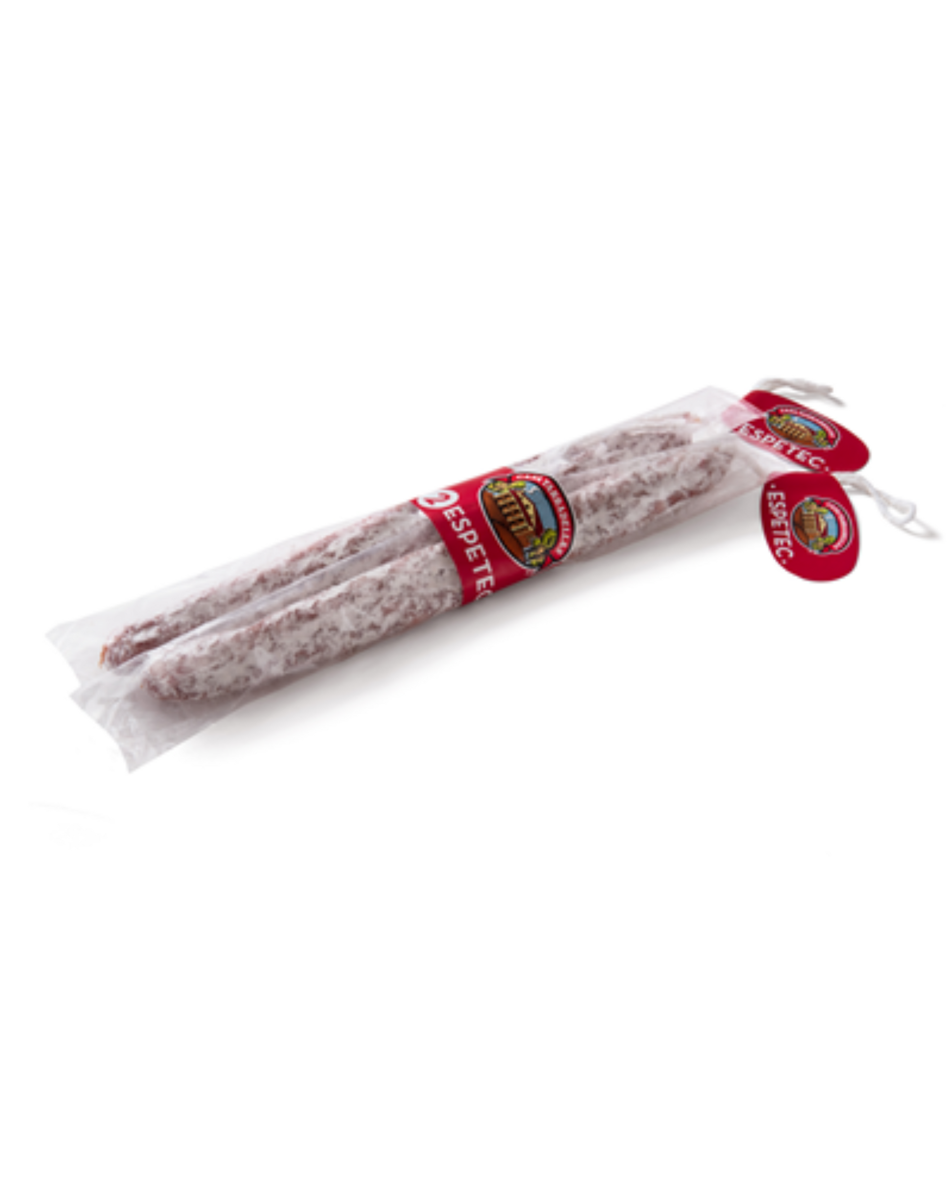 Espetec curado tipo fuet, elaborado con carne magra de cerdo y especias suaves, presentado en pieza larga de 1 metro.