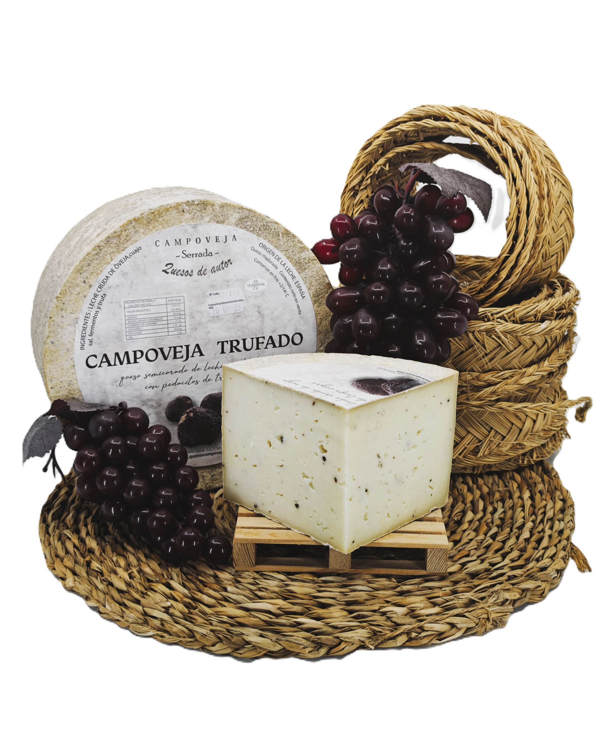 El Queso Campoveja con Trufa es un queso curado de leche 100 % de oveja con auténtica trufa negra, que aporta un aroma elegante y un sabor envolvente.