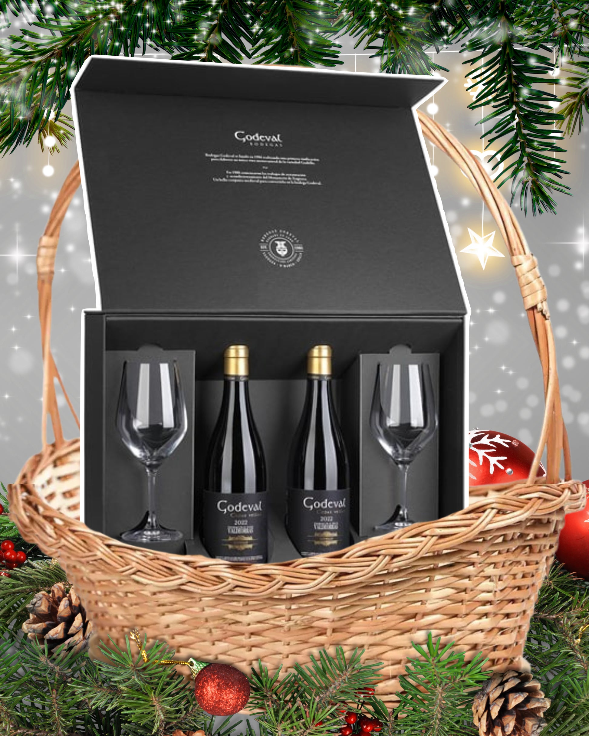 Un estuche elegante que contiene dos botellas del aclamado Godeval Cepas Vellas 2022, elaborado con uvas Godello procedentes de viñas viejas de Valdeorras, junto con dos copas exclusivas para disfrutarlo en todo su esplendor.