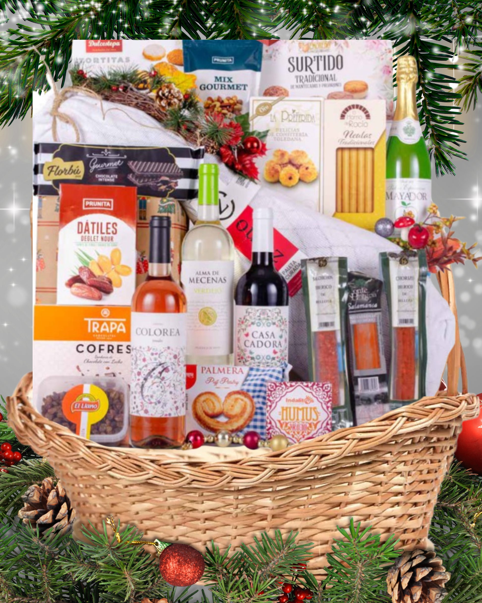 Una cesta que destaca por su presentación imponente y su paleta de calidad, ideal como obsequio empresarial o familiar. Combina sabores salados y dulces con vinos equilibrados, ofreciendo una experiencia gourmet completa y elegante.